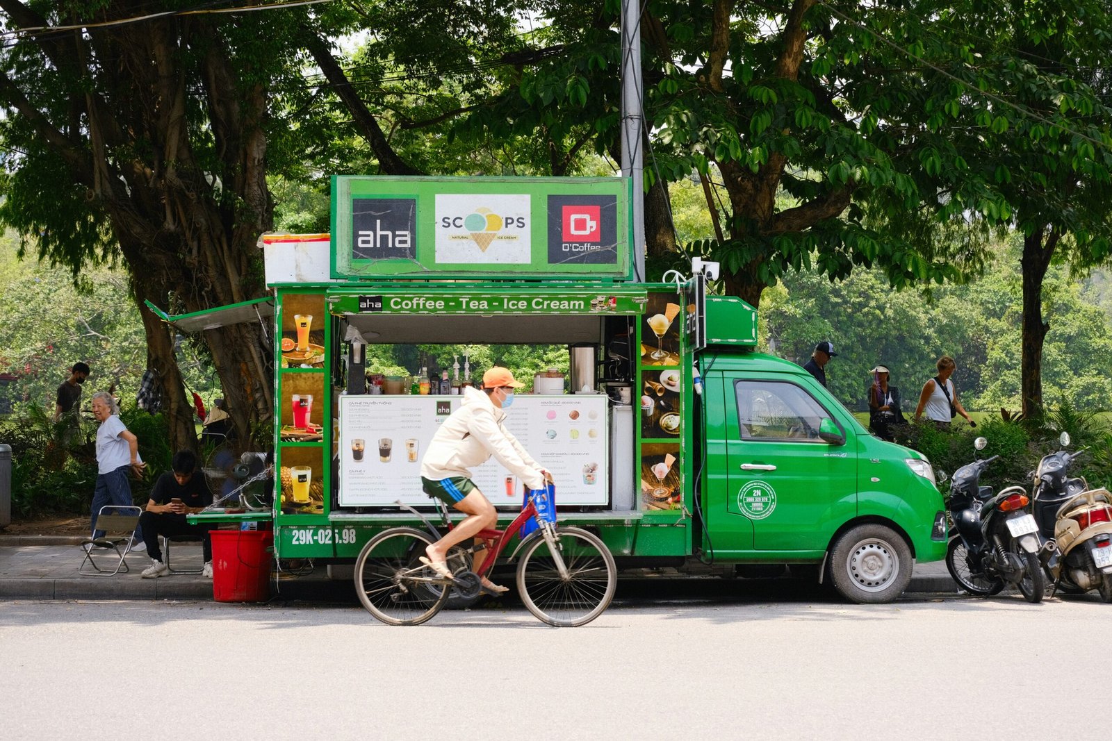 title: A green food truck sells drinks on a road. – Eco-friendly mobile stands