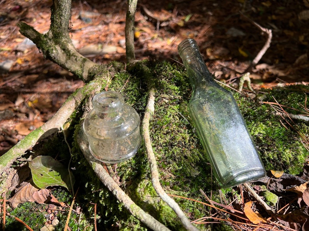 Alt: a couple of empty glass bottles sitting on top of a moss covered ground